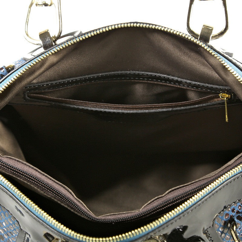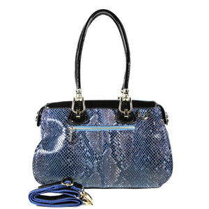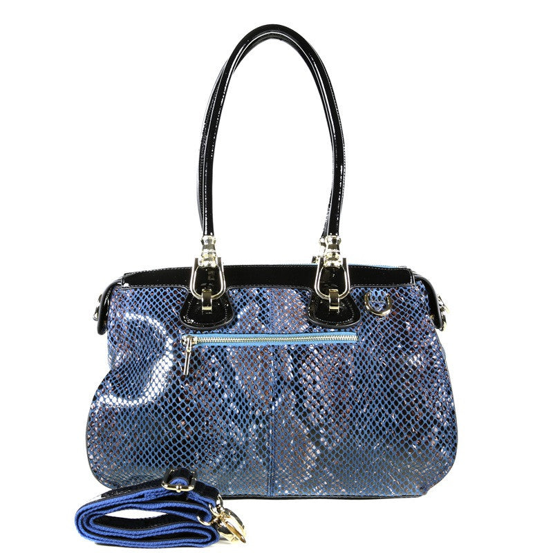 Two qualities make this Bobby Schandra Patent Leather Satchel Tote one of the hottest bags available: Style and Functionality. Presented here in a cool, beautiful blue, this stunning piece features a structured, tailored look, giving a professional edge to a sassy bag. The accents set it apart from the fold, including gold Italian hardware and a sleek, sexy snake print. Not only is the design unparalleled, but the features listed below make it obvious why this handbag is incredibly functional, organized and easy to use! Adjustable Cross-Body strap to ensure perfect fit, either over the shoulder or across the body Back Zipper Pocket for easy access to important items (Keys, Cell Phone, etc.) Strap is removable so bag can be carried as a tote, if so desired Inner Divider Zipper Pocket, creating two "sides" to the bag Inner optional cell phone pocket Additional inner pockets for organization This bag can also be worn as a hands-free messenger style bag! Included is an attachable cross-body strap that can be adjusted to fit your body. Many more functional features are listed below: Back Zipper Pocket for easy access to important items (Keys, Cell Phone, etc.) Inner Divider Zipper Pocket, creating two "sides" to the bag Inner optional cell phone pocket Additional inner pockets for organization Dimensions: Length-14 3/4" Height-9 1/2" Width-7 1/2" Handle Drop Length: 10 3/4" Attachable Crossbody Strap Length (adjustable): 12"